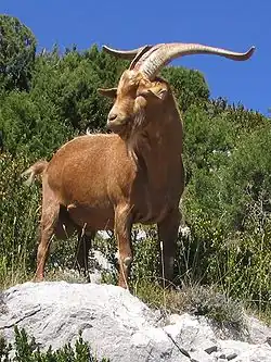 | koza šrouborohá, markhur (Capra falconeri) | hory západního Himálaje | girgentanská koza ze Sicílie, některá plemena z Kavkazu, snad i (středoasijská kašmírová plemena koz, |
