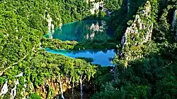 Krasová jezera jsou terasovitě rozložená a spojená průtoky. Jsou součástí krajiny, která spadá do systému Dinárských hor.[1]
