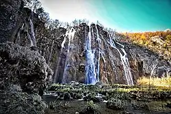 Jednotlivá jezera jsou oddělená travertinovými hrázemi, po kterých voda padají vodopády. Největší z vodopádů (Velký vodopád, chorvatsky Veliki slap) má výšku 78 m. Je nejvyšším na území Chorvatska. Výškový rozdíl mezi nejvýše položeným jezerem a nejnižším je skoro 150 metrů.[1]