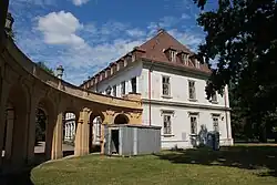 Hlavní zámecká budova je dvoupatrová a má obdélný půdorys.[4] Druhé patro pochází z přestavby v devatenáctém století, kdy byl také střední rizalit v zahradním průčelí zvýšen o atikové polopatro zakončené balustrádou. Nad rizalitem se zdvihá kupole, která je dominantou zámku.[6] Na severní straně budovy se nachází klenutý podjezd z roku 1852. Od hlavní budovy směřují směrem k východu a západu arkádové chodby.[4] Na konci východní arkády byl v devatenáctém století přistavěn pavilon určený pro císařův doprovod,[6] zatímco na západě stojí klasicistní budova,[7] v níž bývala kuchyně, cukrárna a obytné pokoje služebnictva.[6]