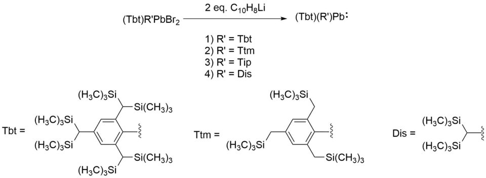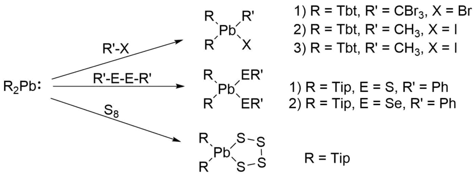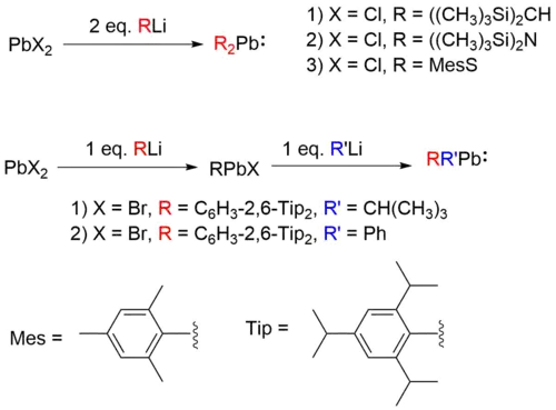 - ↑ a b c KANO, Naokazu; SHIBATA, Kazusato; TOKITOH, Norihiro; OKAZAKI, Renji. Synthesis, Structure, and Reactivity of Kinetically Stabilized Divalent Organolead Compounds (Plumbylenes). Organometallics. 1999, s. 2999–3007. ISSN 0276-7333. doi:10.1021/om990188z.