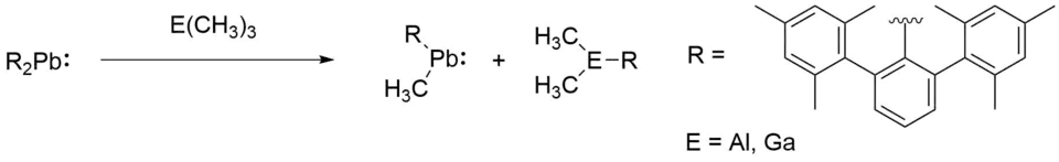 Plumbyleny lze také zapojit do reakcí se sloučeninami prvků 13. skupiny E(CH3)3 (E = Al, Ga).[18]