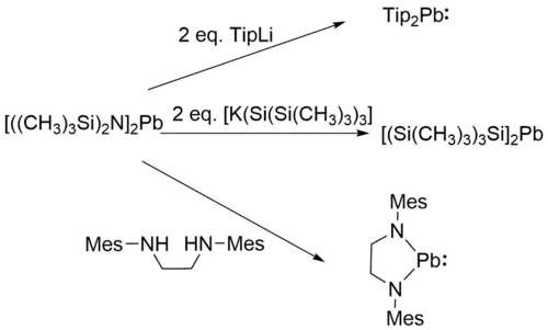 Transmetalacemi s [((CH3)3Si)2N]2Pb byly vytvořeny diaryl-,[6] disilyl-,[7] a nasycené N-heterocyklické plumbyleny.[8]