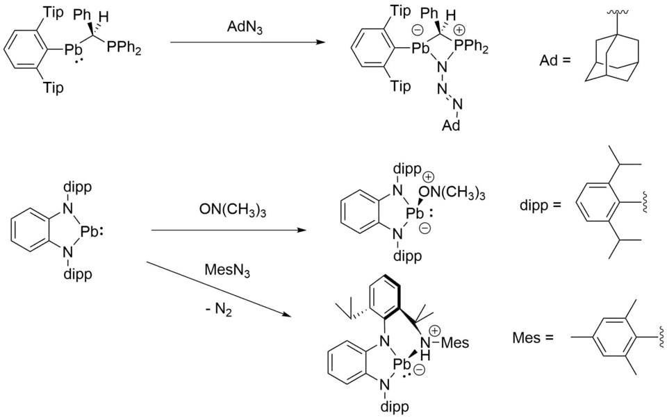 U AdN3 se koncový dusík azidoadamantau váže na plumbylen vznikem můstku mezi Lewisovsky kyselým atomem Pb a zásaditým atomem P;[27] v případě MesN3 azid uvolňuje N2 za vzniku nitrenu, který se poté naváže na vazbu C-H arenové skupiny a koordinuje na Pb jako Lewisova zásada.[26]