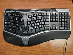 Ergonomická – kombinace tradičních a speciálně tvarovaných kláves, často s prodlouženými opěrkami (přirozenější pozice zápěstí při psaní, snižující jejich zátěž, nebo riziko syndromu karpálního tunelu), často rozdělený či zakřivený blok písmen, pro lepší postavení pod rukama