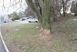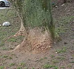 Šedavé zbarvení spodní části kmene, někdy trhliny v borce, nekrotizované skvrny na okrajích listů. Suché plochy v porostu velmi nízkých rostlin, někdy obklopené okrajem s bujnější vegetací, typické poškození trávníků „vypálením“. Na frekventovaných místech silný zápach.
