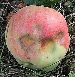Poškození listů a větviček u jabloně.