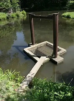 Funkční požerák na lesním rybníčku, hráz tvoří zadní část požeráku -