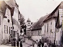 Někdejší Nádražní ulice v roce 1910, na snímku vpravo je synagoga