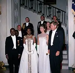 Prezident Félix Houphouët-Boigny a první dáma Marie-Thérèse Houphouët-Boigny v Bílém domě s prezidentem Kennedym a první dámou Jacqueline Kennedyovou v roce 1962.