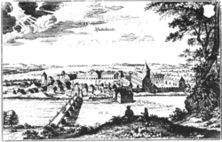 Podobně jako pro mnoho dalších měst, utrpěly Poděbrady značné škody za třicetileté války. Město bylo vypleněno už několik dní po bitvě na Bílé hoře, několikrát ho obsadila švédská a saská vojska, ovšem velkou zátěží pro jeho obyvatele byl i pobyt vojsk císařských. V této době byla zničena většina dosavadních písemností o historii města.[27] Navíc velký požár z roku 1681 město kompletně zničil, včetně obou předměstí (zámek nevyhořel),[28] přičemž nové domy už byly stavěny z kamene a cihel (ničivých požárů však bylo v historii města více – například v letech 1453 a 1832).[29] Až do poloviny 18. století pak město, zejména vinou ohromného zatížení daněmi[30] a úpadku obchodu a řemesel, stagnovalo a dostávalo postupně zemědělský charakter, který si udrželo až do poloviny 19. století.[31]