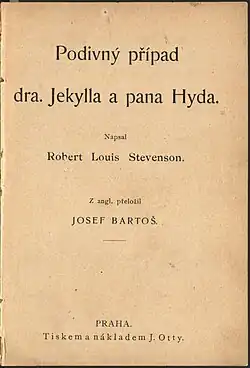 - STEVENSON, Robert Louis. Podivný případ Dra Jekylla a pana Hyda. Překlad Josef Bartoš. Praha: J. Otto, 1900. Dostupné online.
