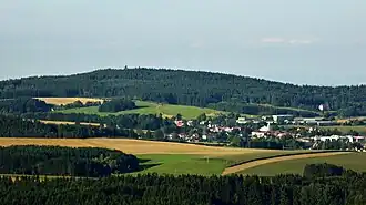 Prosíčka, vrchol 739 m n. m. v lokalitě přírodní památky se skalním útvarem na úzkém hřbetu, pohled ze svahu vrcholu Kamenice (780 m n. m.), v údolí část zástavby v obci VěcovProsíčka 739 m (Borovnice), významný bod, rozhledové místo, na zalesněném úzkém hřbetu přírodní památka Prosička[14] se skalním útvarem vypreparovaným mrazovým zvětráváním v pleistocénu