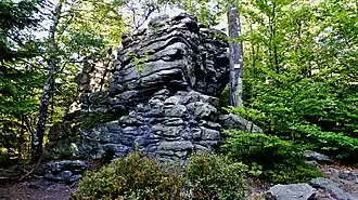 Skalní útvar ve vrcholové části Pohledecké skály (813 m n. m.), z větší části nepřístupné lokality v Chráněné krajinné oblasti Žďárské vrchy, od názvu vrchu odvozeno jméno geomorfologického okrsku Pohledeckoskalská vrchovina