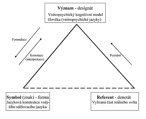 Souvislost mezi reálným světem, jeho poznáním, poznáním vytvořeným vnitropsychickým kognitivním (znalostním) modelem a sdělením o poznaném, graficky znázorňuje trojúhelník uvedený v obr. 1. Říká se mu sémantický či sémiotický, podle toho, na co se při výkladu klade důraz. Najdeme ho v mnoha modifikacích a pod jmény mnohých autorů, např. Fregeho, Ogdenův–Richardsův a další. Podstava trojúhelníka nezobrazuje žádný vztah, neboť veškeré vztahy jsou zprostředkovány lidskou psýchou umístěnou v trojúhelníku na jeho horním vrcholu. Pokud by podstava měla zobrazovat nějaký vztah, musel by zde být další lidský aktér a to není. Někdy se do vztahů v trojúhelníku omylem vkládá vnější pozorovatel (další aktér), a vniká dojem, že podstava nějaký vztah zobrazuje. Vnější pozorovatel se na trojúhelník dívá, neúčinkuje v něm, jeho pohledem, ani jeho přemýšlením nad vztahy v trojúhelníku, se v trojúhelníku nic nemění.