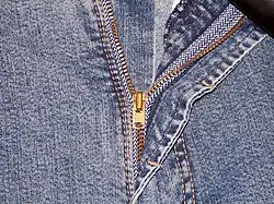 Poklopec je tvořen různě dlouhým nastřižením látky, která je obešita, aby se dále nepárala.[7] Uprostřed je nejčastěji všito zdrhovadlo, někdy knoflíky. Ve vrchní části se nachází větší knoflík nebo kovový háček, který slouží k tomu, aby se zapnutý zip nerozjížděl či knoflíky nerozepínaly.
