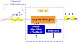 Nejspolehlivější a nejúčinnější technologie na snížení vlivu PMD je využití adaptivní optiky pro srovnání rozptýlených impulsů na správné pozice. Tato technologie je zobrazena vpravo na obrázku. Rozptýlené bity z optické sítě jsou srovnány pomocí PMD korekce. Tato korekce optické bity opět přerovná a přetvaruje, před tím než jsou dekódovány přijímačem. Adaptivní optika pro korekci je řízena inteligentním algoritmem, který analyzuje optické bity.