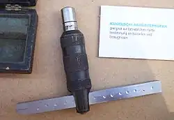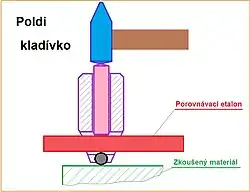 Před měřením se do otvoru v tvrdoměru vsune pod kalenou kuličku porovnávací tyčinka o známé tvrdosti a pevnosti ze soupravy. Tím je kladívko Poldi připraveno k měření.