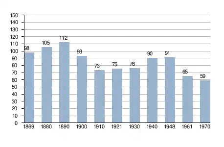 Vývoj počtu obyvatel od roku 1869 po 1970 vyjadřuje následující graf:[2]