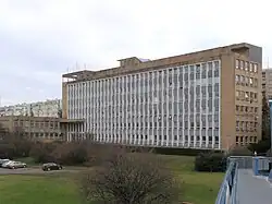 ![]() Pohled na čelní stranu polikliniky (s hlubokým rizalitem, patrnou střešní terasou a střešním pavilonem) | |