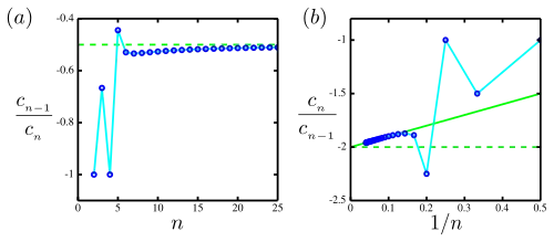 - Základním případem je, když koeficienty jednoznačně mají stejné znaménko nebo pravidelně znaménka střídají. Jak již bylo ukázáno, v mnoha případech existuje limita a pak Záporné znamená, že singularita omezující konvergenci je na záporné ose. Tuto limitu odhadneme vynesením hodnot v závislosti na a grafickou extrapolací na (efektivně ) lineárním napojením. Průsečíky s odhadují převrácené hodnoty poloměru konvergence, . Tento graf se nazývá Dombův–Sykesův graf.