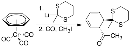 Benzenový ligand v (η6-C6H6)Cr(CO)3Mi může být deprotonován,[9] například s organolithnými sloučeninami se vytváří adukty obsahující cyklohexadienylové ligandy. Následnou oxidací komplexu se uvolní substituovaný benzen.[10][11] Oxidace atomu chromu jodem a jeho sloučeninami může vyvolat výměnu arenových ligandů; chromjodidové meziprodukty ovšem nejsou dobře popsány.[12]
