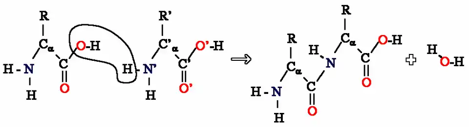 Příklady kondenzačních reakcí, probíhajících v živých organismech, jsou enzymatické kondenzace aminokyselin za vzniku peptidů. Na obrázku níže je znázorněna kondenzace alifatické aminokyseliny vedoucí k vytvoření polyamidu, s důrazem na aminové a acylové skupiny.