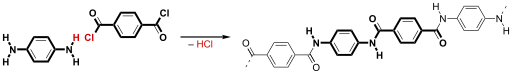 Na následujícím obrázku je zobrazen vznik aramidu reakcí dvou různých monomerů, které se v řetězci polymeru střídají: