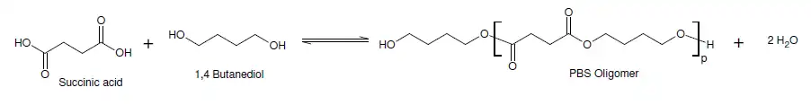 Podobně jako ostatní polyestery, například polyethylentereftalát, se PBS dá vyrobit dvěma hlavními způsoby: transesterifikací (z diesterů kyseliny jantarové) a přímou esterifikací. Nejčastější je přímá esterifikace kyseliny jantarové butan-1,4-diolem, skládající se ze dvou kroků: Nejprve je nadbytek diolu esterifikován kyselinou za vzniku oligomerů a odštěpení vody.