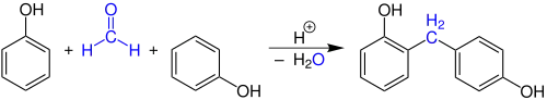 Reakce formaldehydu se dvěma fenoly za vzniku difenolu a vody.