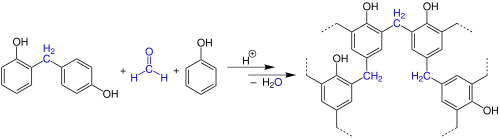 Polykondenzace formaldehydu s difenolem a fenolem na polyfenol za uvolnění vody.