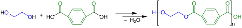 Polykondenzace ethandiolu s karboxylovou kyselinou na polyester za uvolnění vody.