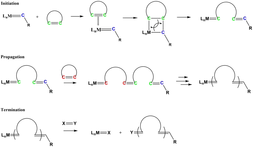 Mechanismus polymerizací metatezí s otevíráním kruhu je podobný jako u metatezí alkenů. Iniciace spočívá v koordinaci cykloalkenu na alkylidenový komplex kovu, po kterém následuje [2+2] cykloadice, jíž vzniká metalacyklobutanový meziprodukt, který se přeměňuje na nový alkyliden.[15][16]