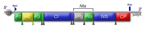 Po vzniku polyproteinu (na hostitelském ribozomu) dochází následně k jeho rozstříhání na jednotlivé virové proteiny pomocí specifických proteináz.[1]