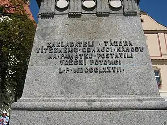 ZAKLADATELI TÁBORA VÍTĚZNÉMU OBHÁJCI NÁRODU NA PAMÁTKU POSTAVILI VDĚČNÍ POTOMCI L.P. MDCCCLXXVII
