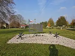 Před deskou je umístěn povalený kříž doplněný dvěma ocelovými přilbami, hlavní pušky a ostnatým drátem. V rozích upraveného prostranství jsou umístěny čtyři zmenšené ocelové rozsocháče.