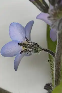 Květy bez listenů jsou oboupohlavné, pětičetné a v počtu až čtyřiceti vytvářejí vijanové květenství. Každý květ má stopku asi 2 mm dlouhou, jenž se za plodu prodlužuje na 5 až 7 mm a odstává šikmo vzhůru. Trubkovitý vytrvalý kalich je dlouhý asi 2 mm a za plodu se prodlužuje až na 5 mm, kališní trubka má husté háčkovité chlupy, kališní cípy jsou špičaté, trojúhelníkovité, hustě chlupaté a za plodu k sobě přitisklé. Korunní trubka bývá asi 1,5 mm dlouhá, v ústí jasně žlutá a nevyčnívá z kalichu, korunní lem je miskovitý a má asi 4 mm v průměru, bývá světle modrý až modrý, zřídka je růžový. Nitky pěti tyčinek jsou vespod ke korunní trubce přirostlé a výše volné, jejich částečně zaškrcené prašníky obsahují pyl s elipsoidními zrny. Semeník je čtyřpouzdrý, blizna je hlavatá, na bázi gynecea je prstenčitý desetizubý val se žlázkami vylučující nektar pro opylovače. Rostlina je opylována širokým spektrem opylovačů, od včely medonosné a mnoha samotářských včel, přes mouchy a brouky až po třásněnky.