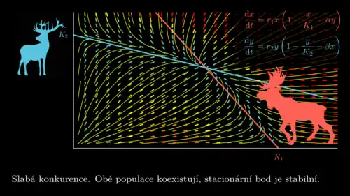 Konkurence dvou druhů je modelována dvojicí logistických rovnic pro dvě populace, přičemž rychlost růstu každé z populací je ještě ovlivněna přítomností druhé populace. V nejjednodušším modelu s mezidruhovou konkurencí přímo úměrnou oběma populacím je matematickým modelem soustava rovnic