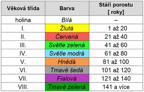 V případě, že v porostu se vyskytuje více etáží, potom jsou v ploše porostu proužky barev podle věkových tříd zastoupených etáží.