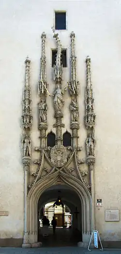 V pozdní gotice bývá používán sedlový portál, jehož vyplně horních rohů připomínají sedlo.[1]