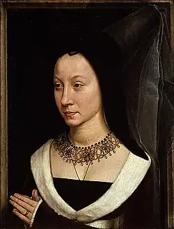 Pokrývka hlavy je variantou zkráceného nebo včelího úlu hennin, tehdy módního na burgundském dvoře. Velmi podobný styl, bez chvostu, je k vidění na starší ze dvou dívek na donátorských panelech s tematikou Svátku Uvedení Páně do chrámu od neznámého mistra, o nemž je známo jen to, že byl žákem Rogiera van der Weydena.[14] Černý pásek pod bradou se na jiných vyobrazeních z tohoto období vyskytuje jen zřídka a byl interpretován jako styl inspirovaný mužským chaperonem, který má vždy dlouhý ocas nebo kornet, někdy se nosí takto ovinutý pod bradou.