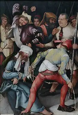 Po odsouzení Ježíše Sanhedrinem na něj někteří plivali – Mk 14, 65 (Kral, ČEP). Zavázali mu oči, bili ho a pak se mu vysmívali: „Hádej, proroku, kdo tě uhodil.“ – Lk 22, 63 (Kral, ČEP). To udělali ti muži, kteří „Ježíše hlídali“ – Lk 22, 63 (Kral, ČEP). Český ekumenický překlad to překládá jako „Muži, kteří Ježíše hlídali“, ale Joel B. Green má tuto frázi za odkaz na „kněze, velitele stráže a starší“ zmíněné v Lk 22, 52 (Kral, ČEP).[3]
