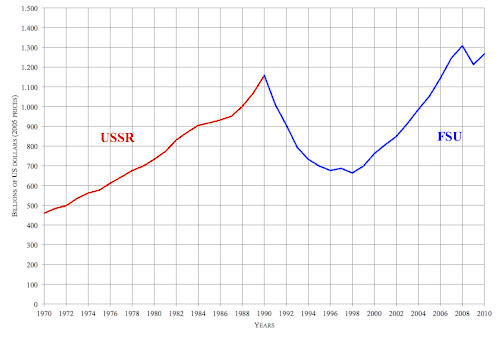 Zhroucení Sovětského svazu proběhlo v důsledku celkové ekonomické stagnace, dokonce recese. Když se zhroutil Gosplan, který záměrně provázal výrobu v jednotlivých sovětských republikách, došlo k narušení vnitrorepublikových vazeb, což vedlo k ještě vážnějšímu rozpadu postsovětských ekonomik.