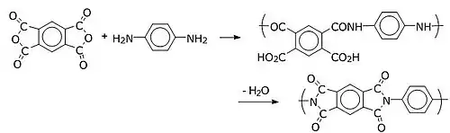 Aromatické polyimidy se vyrábějí reakcí dianhydridů s diaminy, například dianhydridu kyseliny pyromellitové s p-fenylendiaminem; místo diaminů lze též použít diisokyanáty. Díky své lepší rozpustnosti se často místo dianhydridů používají smíšené estery dianhydridů. Kvůli nerozpustnosti polyimidů probíhá reakce dvoustupňově. V prvním kroku se vytváří vysokomolekulární polyaminokyselina v polárním rozpouštědle, jako jsou methylpyrrolidon nebo N,N-dimethylacetamid. Polyaminokyselina se následně přemění na výsledný produkt, který je nerozpustný.