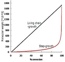 | Průměrná molekulová hmotnost se zvyšuje pomalu a reakce musí probíhat dlouho, pokud se má vytvořit polymer s dlouhým řetězcem | Molekulová hmotnost se na začátku zvyšuje rychle a v průběhu polymerizace zůstává přibližně stejná |