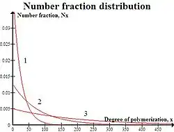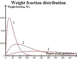 Rozdělení hmotnostních zlomků produktů udává závislost hmotnostních zlomků x-merů ve směsi na jejich molekulové hmotnosti:[10]