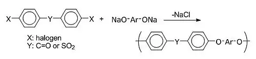Polyethersulfony se vyrábějí nukleofilní aromatickou substituční reakcí aromatických dihalogenidů a bisfenolátových solí. Jsou částečně krystalické a odolávají vodě i mnoha organickým látkám. Používají se na místech, kde se trvale vyskytují teploty 240 až 280 °C, například v automobilovém a leteckém průmyslu jako izolanty.