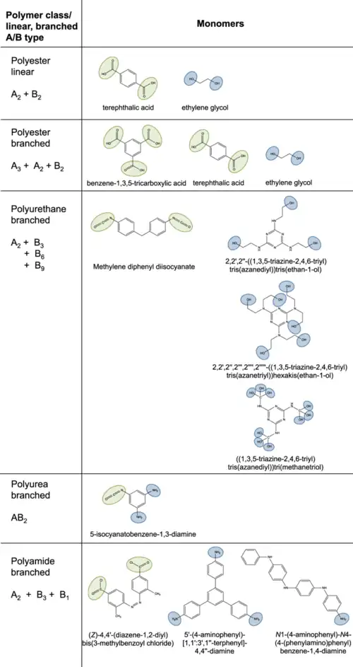 Při použití monomeru majícího v molekule tři nebo více funkčních skupin účastnících se polymerizační reakce se tvoří rozvětvené polymery. Jedním z prvních vytvořených polymerů s touto vlastností byl bakelit. Při reakci se nemusí odštěpovat molekuly vody, ale také například ethen.