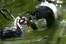 ![]() Potápka americká v hnízdním šatu, pro který je typické černé hrdlo a černá páska přes bílý zobák | |
