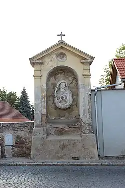 ↑Toskánské pilastry jsou doplněny o další ozdobu, mezi nikou a zastřešením je římsa a stříška kaple není trojhranná, ale oblá.